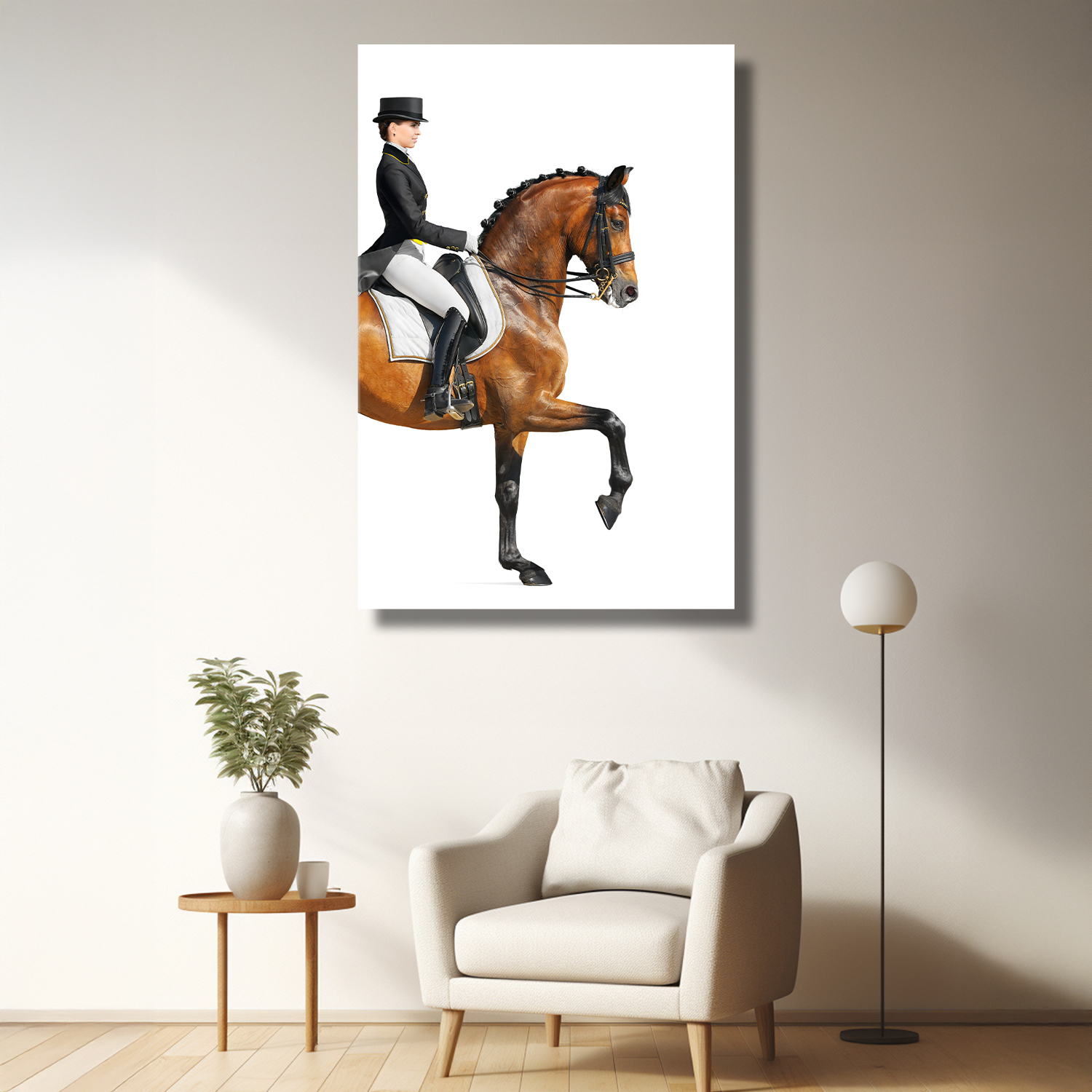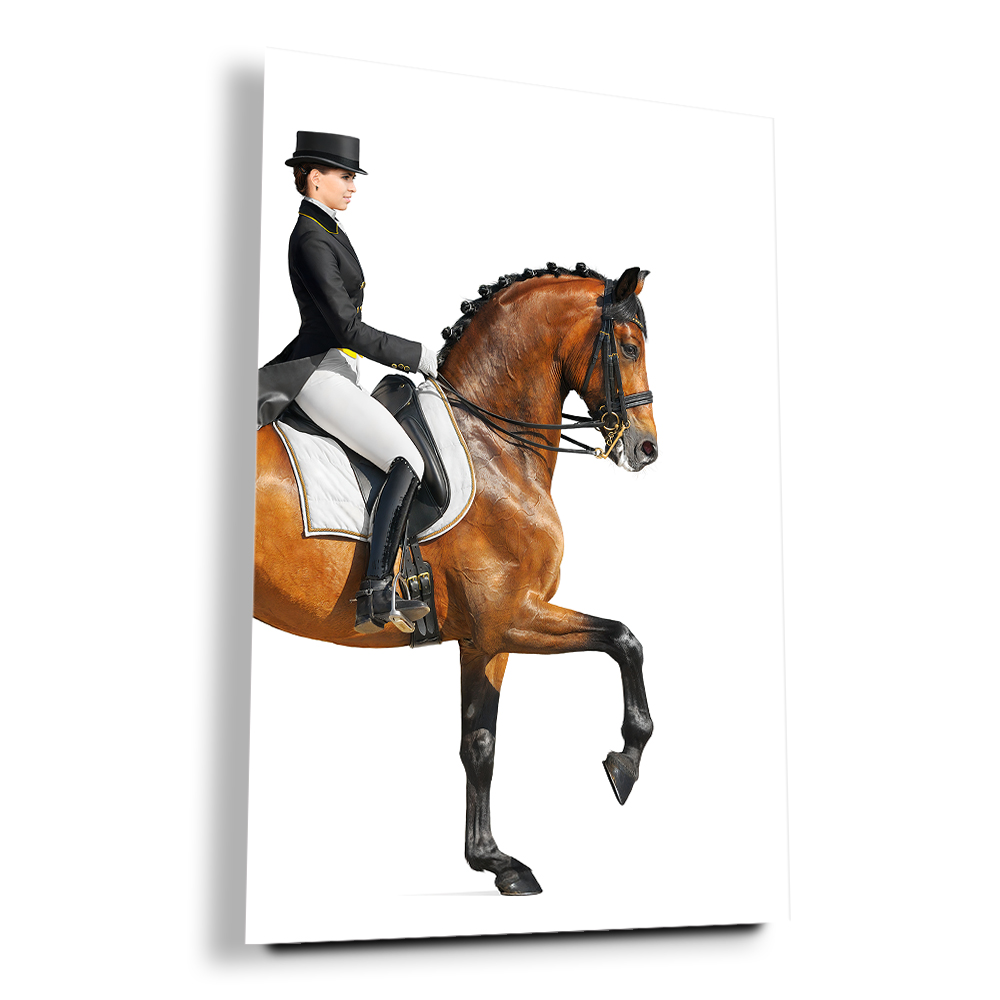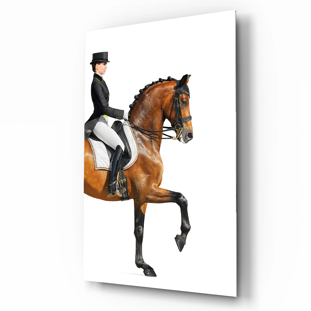 Zarif binici ve asil atın kusursuz uyumunu yansıtan bu tasarım, güç ve zarafeti bir araya getirir. Beyaz arka plan üzerindeki net detaylar modern bir duruş sergiler. Sporun estetiğini ve disiplini dekorasyonla buluşturan etkileyici bir parçadır.