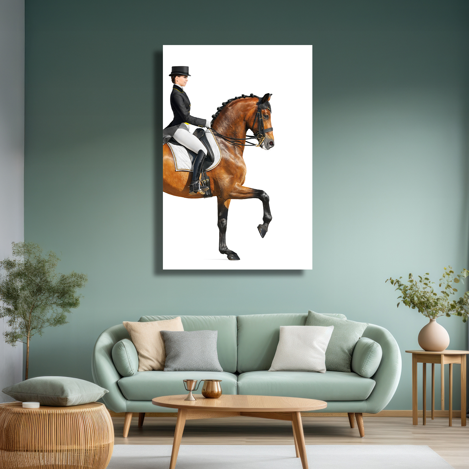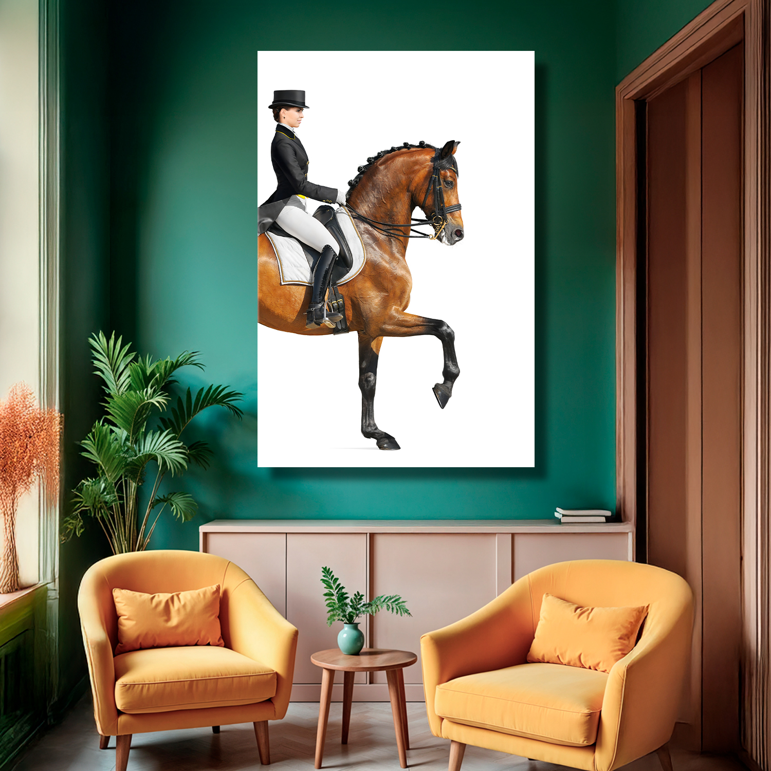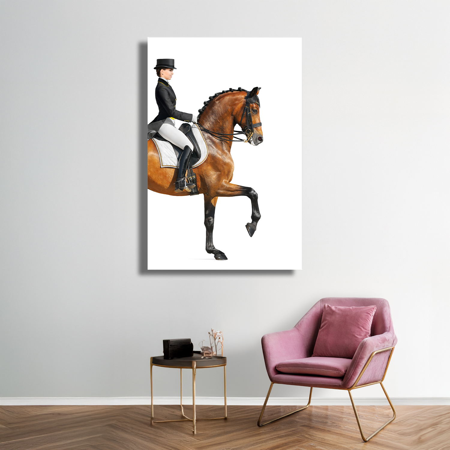 Zarif binici ve asil atın kusursuz uyumunu yansıtan bu tasarım, güç ve zarafeti bir araya getirir. Beyaz arka plan üzerindeki net detaylar modern bir duruş sergiler. Sporun estetiğini ve disiplini dekorasyonla buluşturan etkileyici bir parçadır.