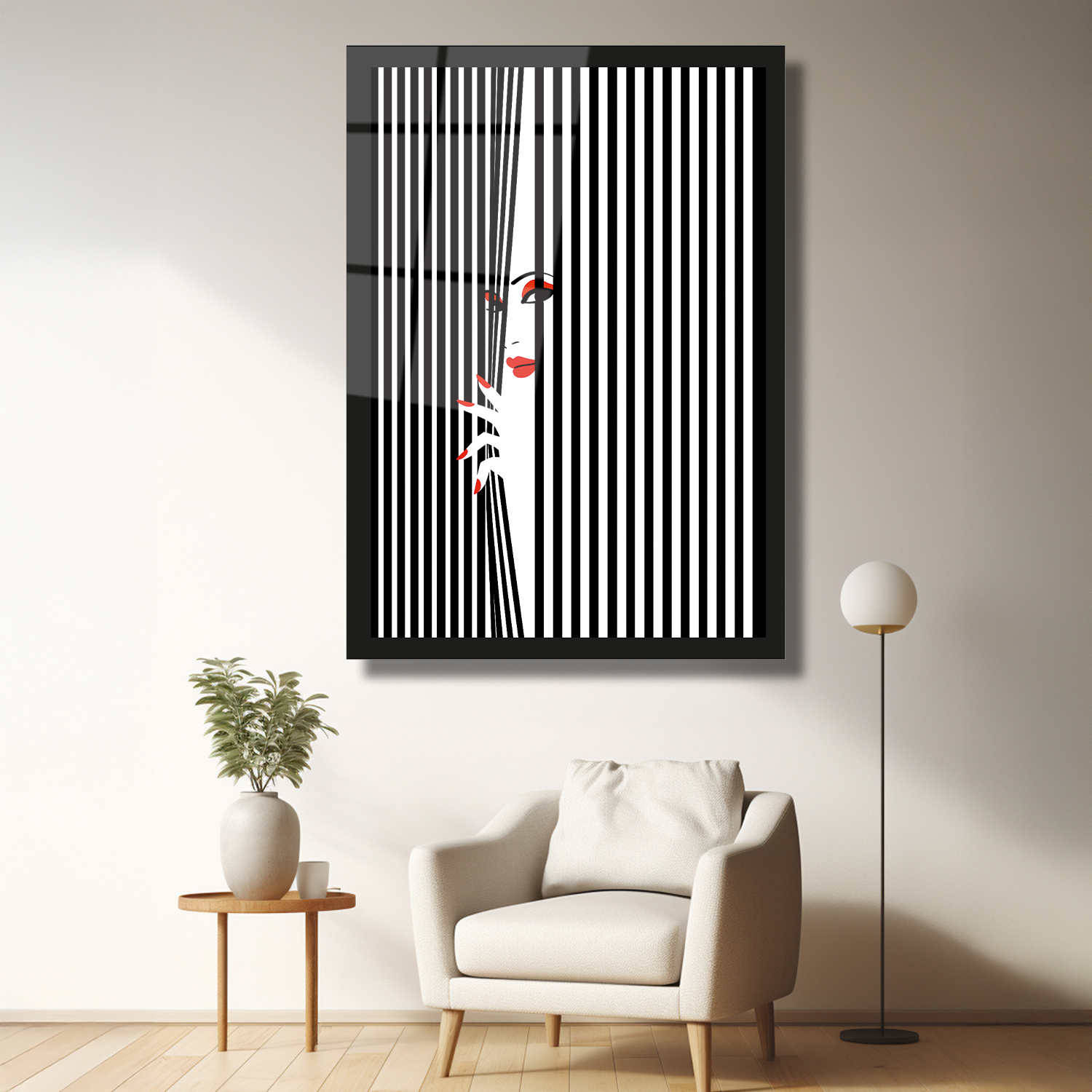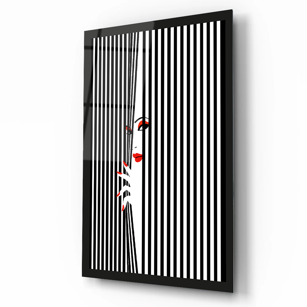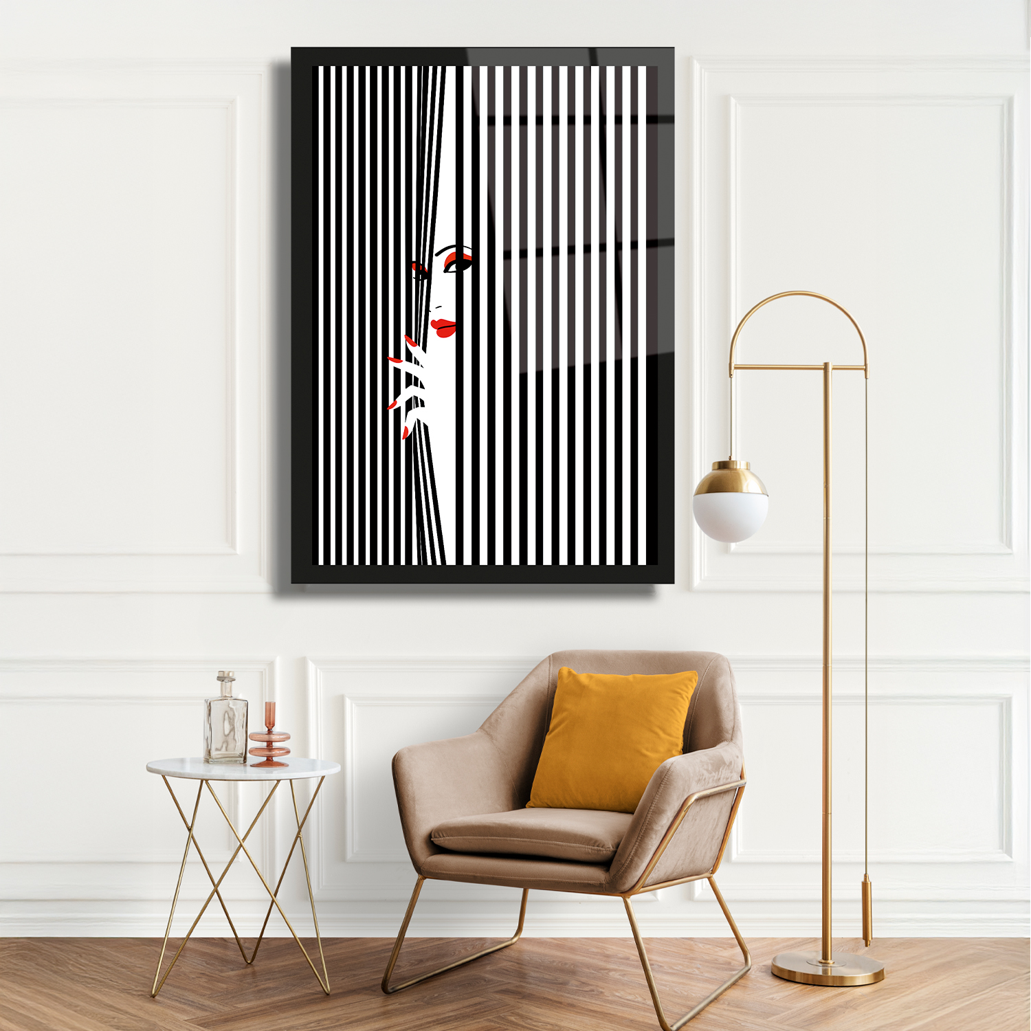 Siyah beyaz dikey çizgiler arasından beliren kırmızı dudaklar ve bakışlar, izleyene güçlü bir gizem duygusu verir. Minimalist tasarımıyla hem modern hem de etkileyici bir dekoratif hava yaratır. Çarpıcı kontrastları sayesinde bulunduğu mekâna sofistike bir dokunuş katar.