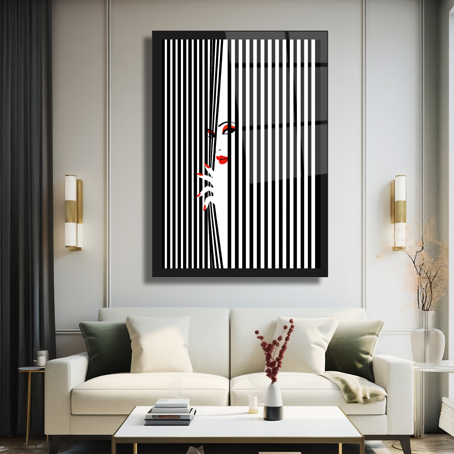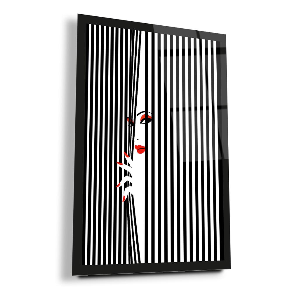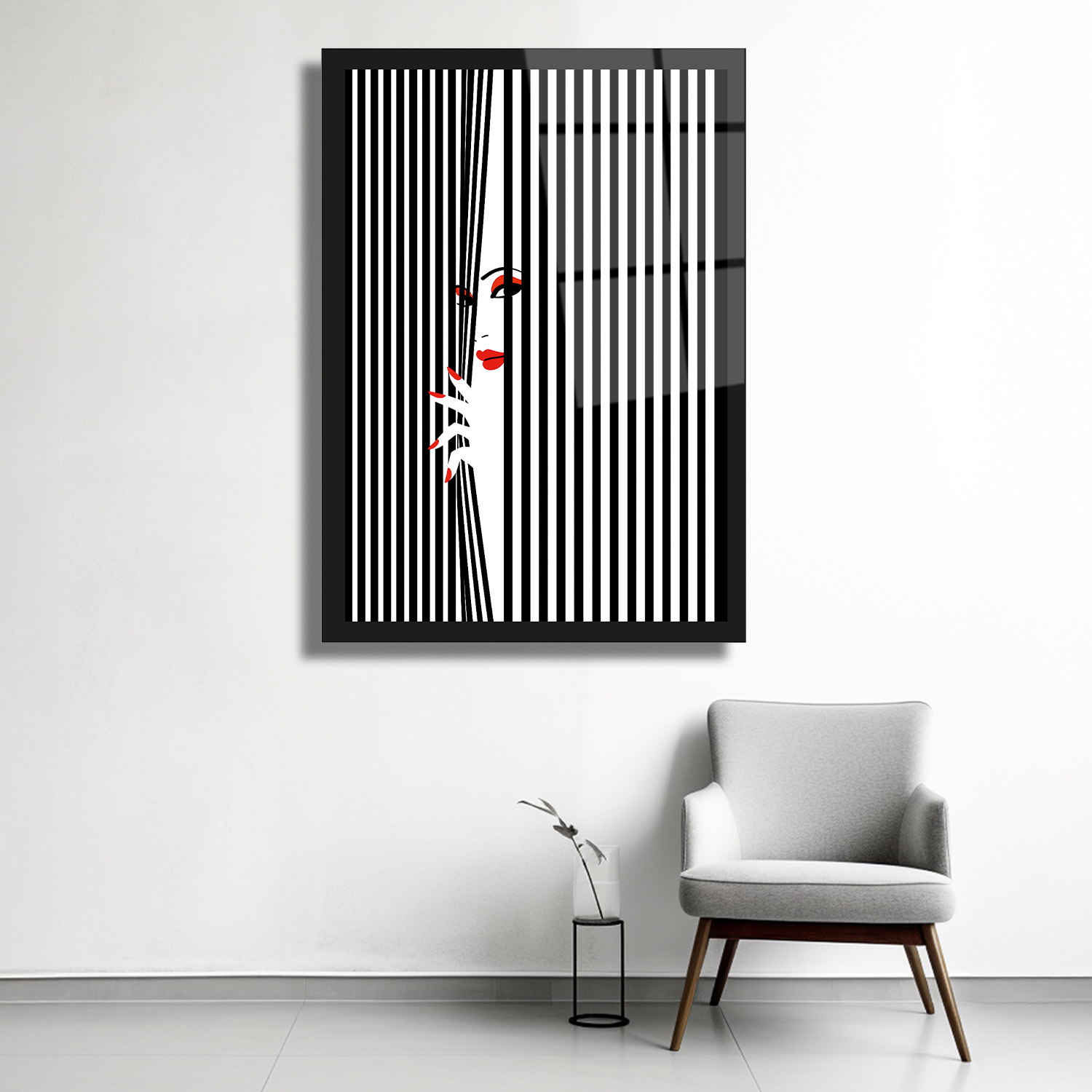 Siyah beyaz dikey çizgiler arasından beliren kırmızı dudaklar ve bakışlar, izleyene güçlü bir gizem duygusu verir. Minimalist tasarımıyla hem modern hem de etkileyici bir dekoratif hava yaratır. Çarpıcı kontrastları sayesinde bulunduğu mekâna sofistike bir dokunuş katar.
