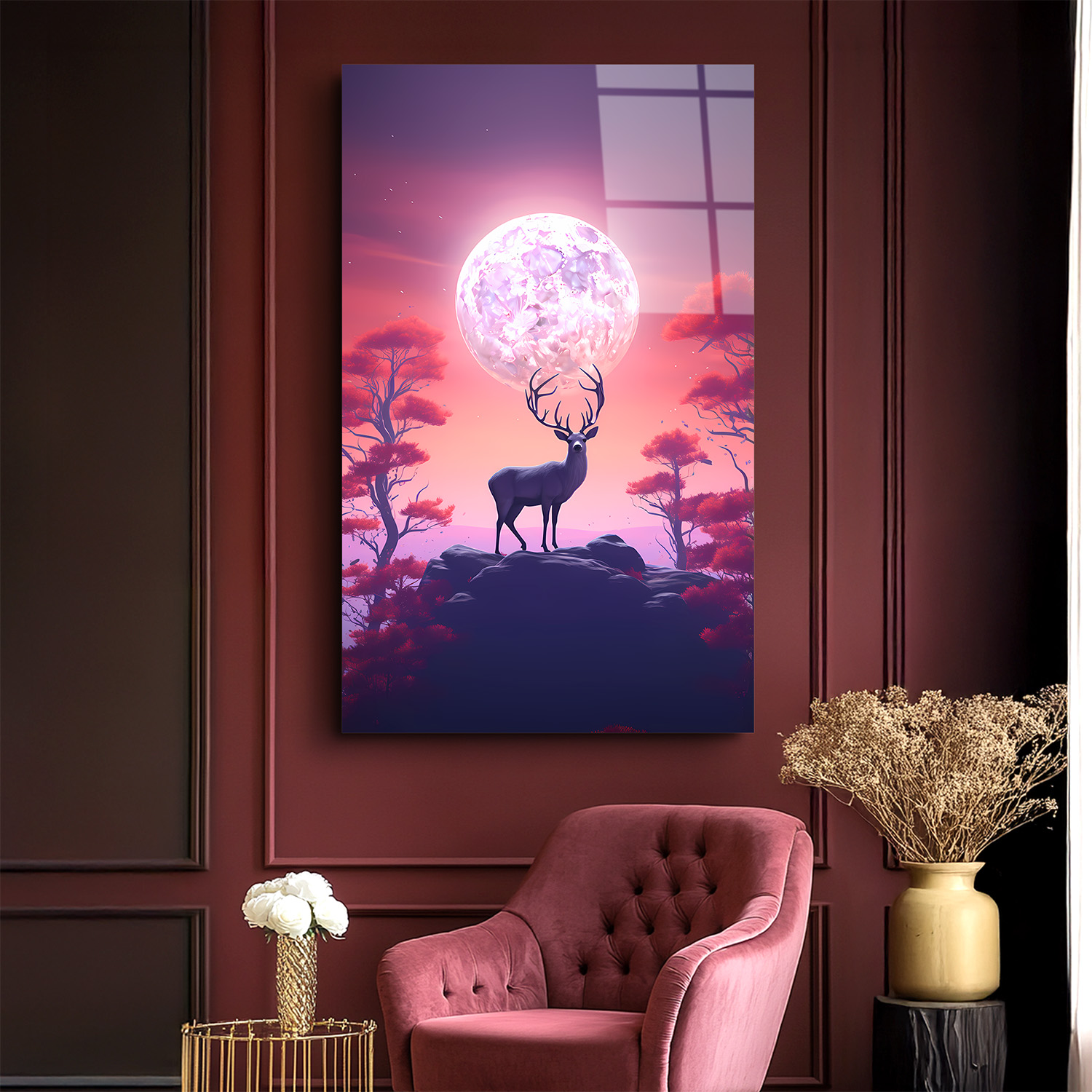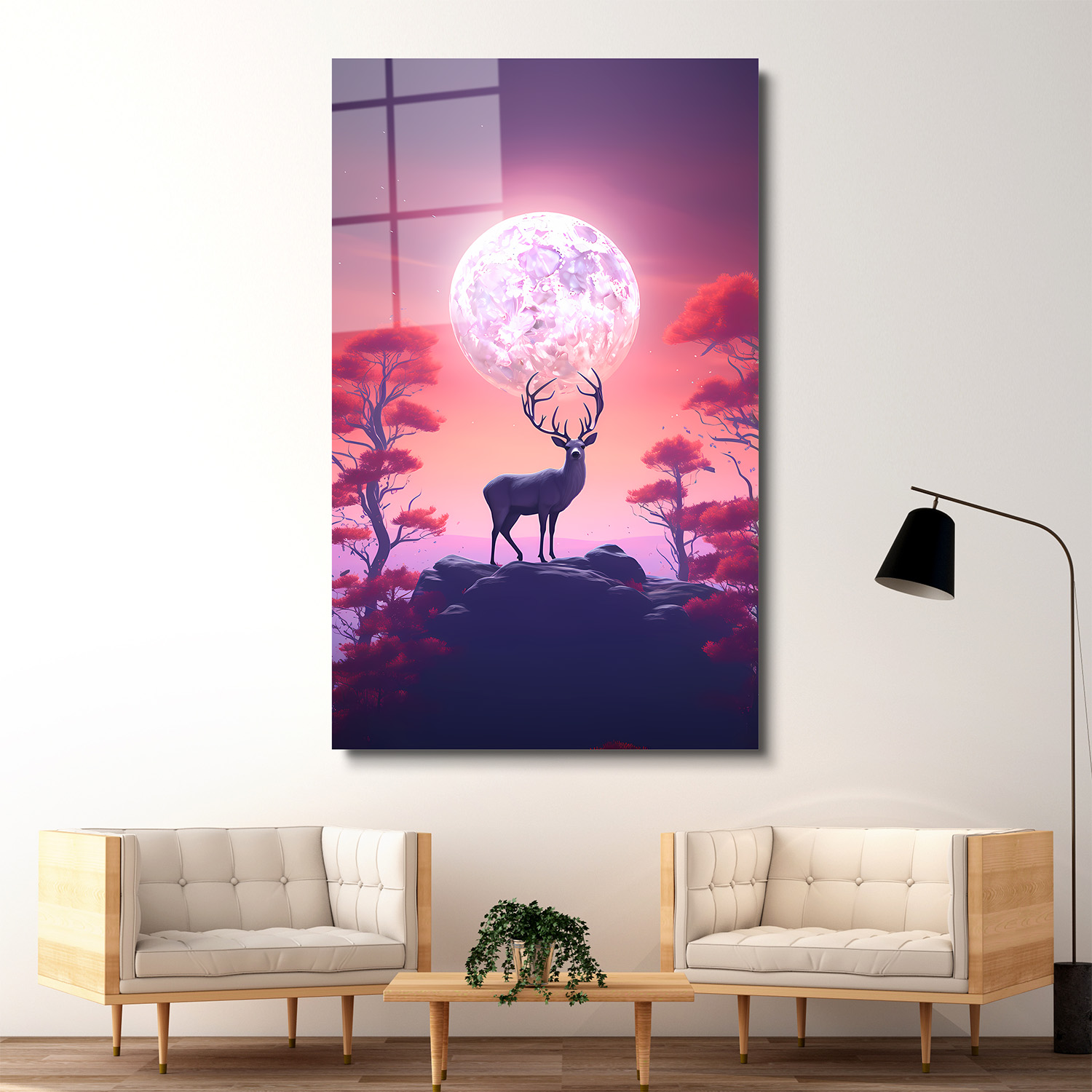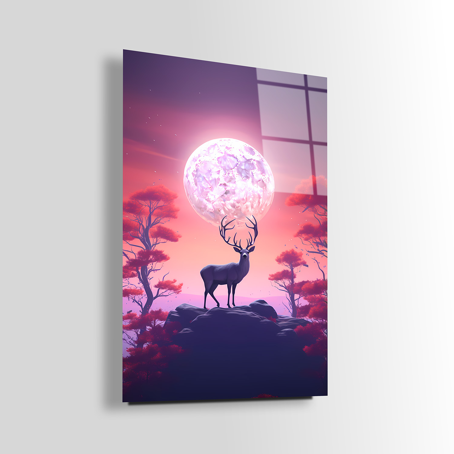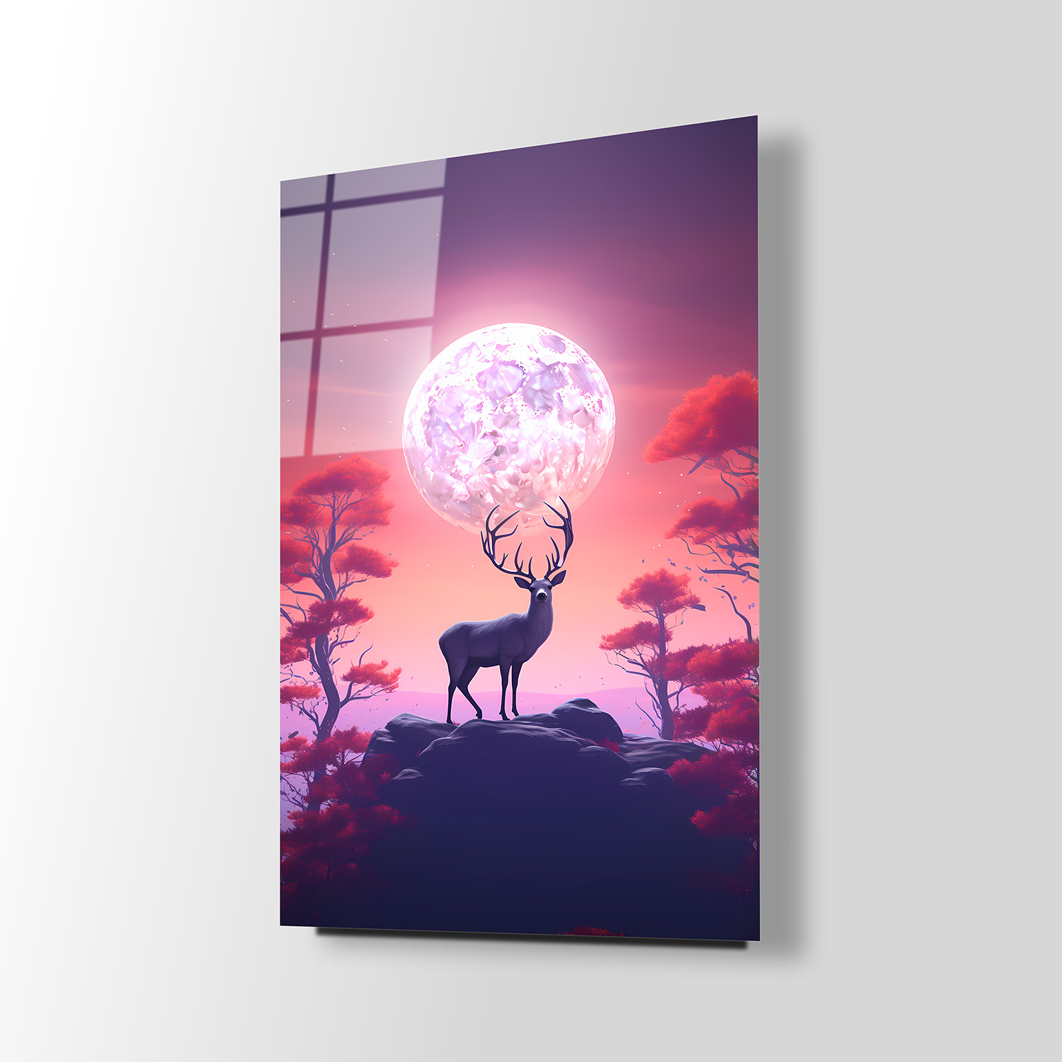 Pembe Gecedeki Geyik Cam Tablo, huzurlu bir gece manzarasında zarif bir geyik figürüyle büyüleyici bir atmosfer yaratıyor. Pembe tonlarının hakim olduğu tasarım, mekâna sakinleştirici ve romantik bir hava katar. Cam yüzeydeki detaylar, tablonun estetik etkisini güçlendirerek modern bir dekorasyon unsuru sunar.