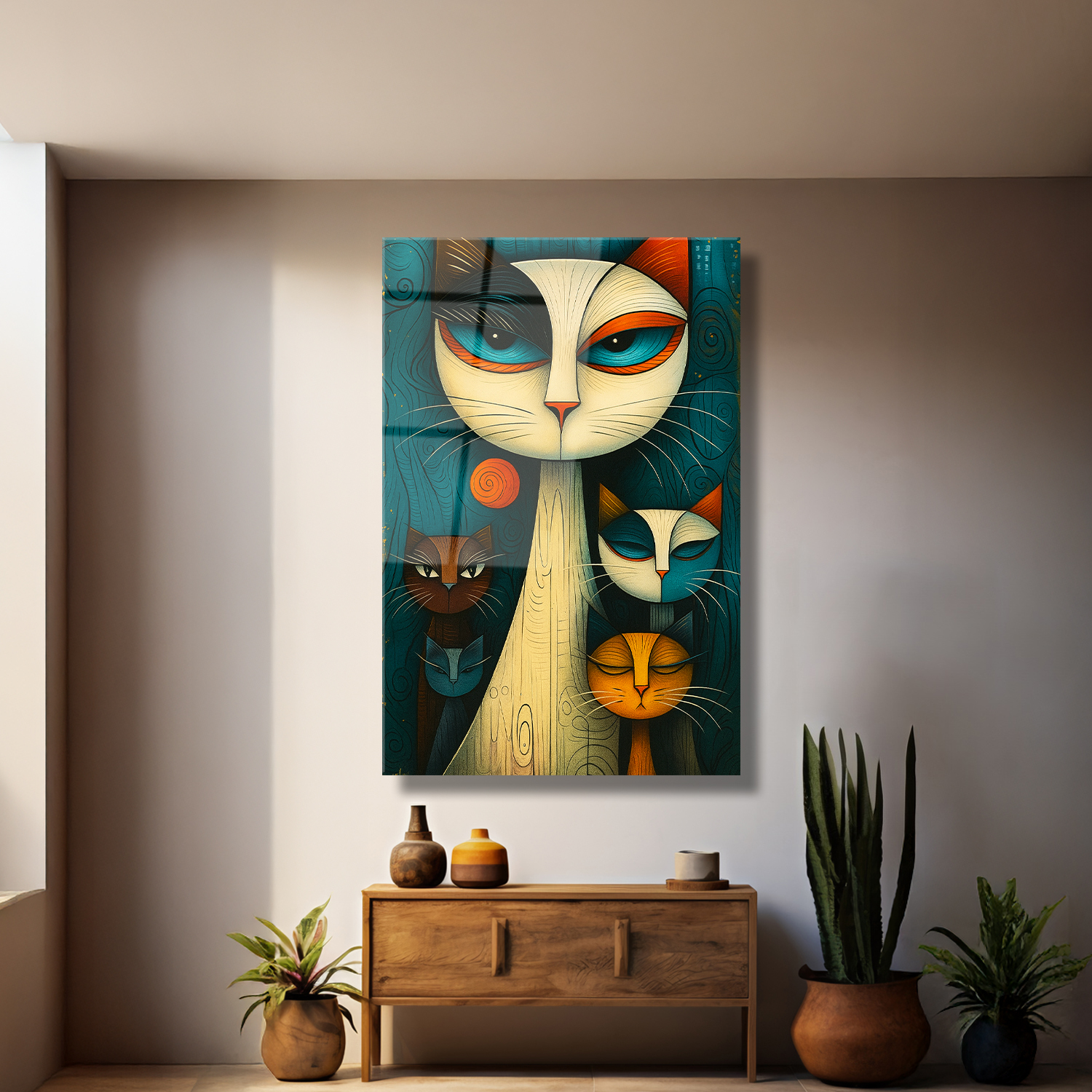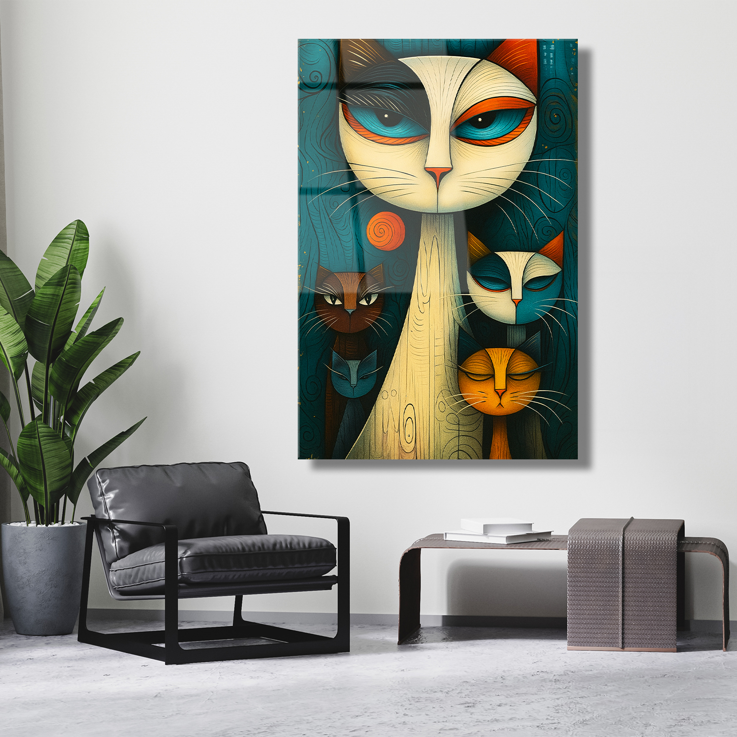 Modern ve stilize çizgilerle tasarlanmış bu cam tabloda farklı renklerde beş kedi figürü dikkat çekiyor. Canlı tonlar ve geometrik dokunuşlarla oluşturulan tasarım, mekâna hem şıklık hem de karakter katıyor. Özellikle kedi severler için sanatsal bir ifade ve dekoratif bir vurgu sunuyor.