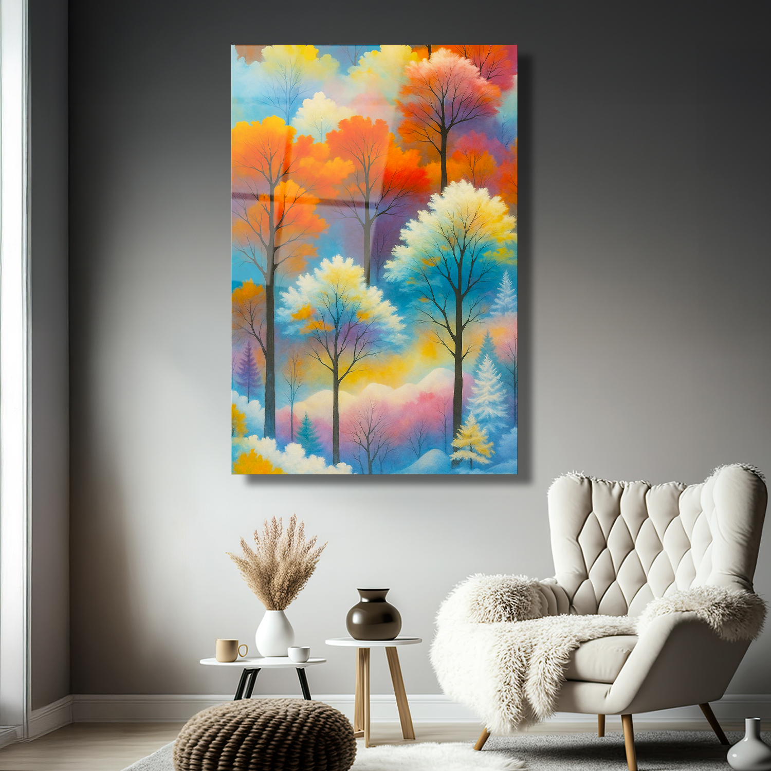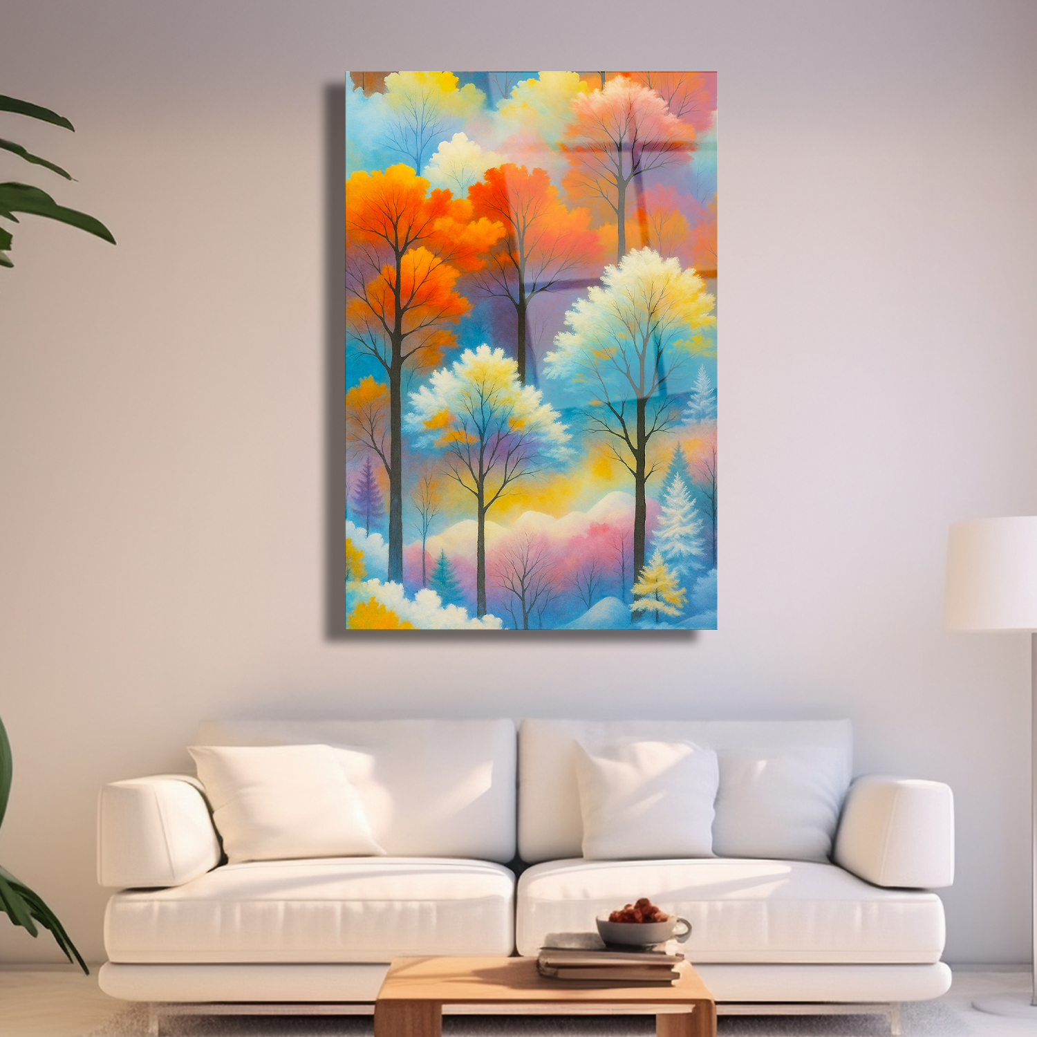 Doğanın dört mevsimini tek bir karede buluşturan bu tasarım, renklerin uyumunu büyüleyici bir şekilde yansıtır. Turuncunun sıcaklığı, mavinin huzuru ve beyazın saflığıyla mekanınıza canlılık katar. Modern ve sanatsal dokusuyla her duvara özgün bir karakter kazandırır.