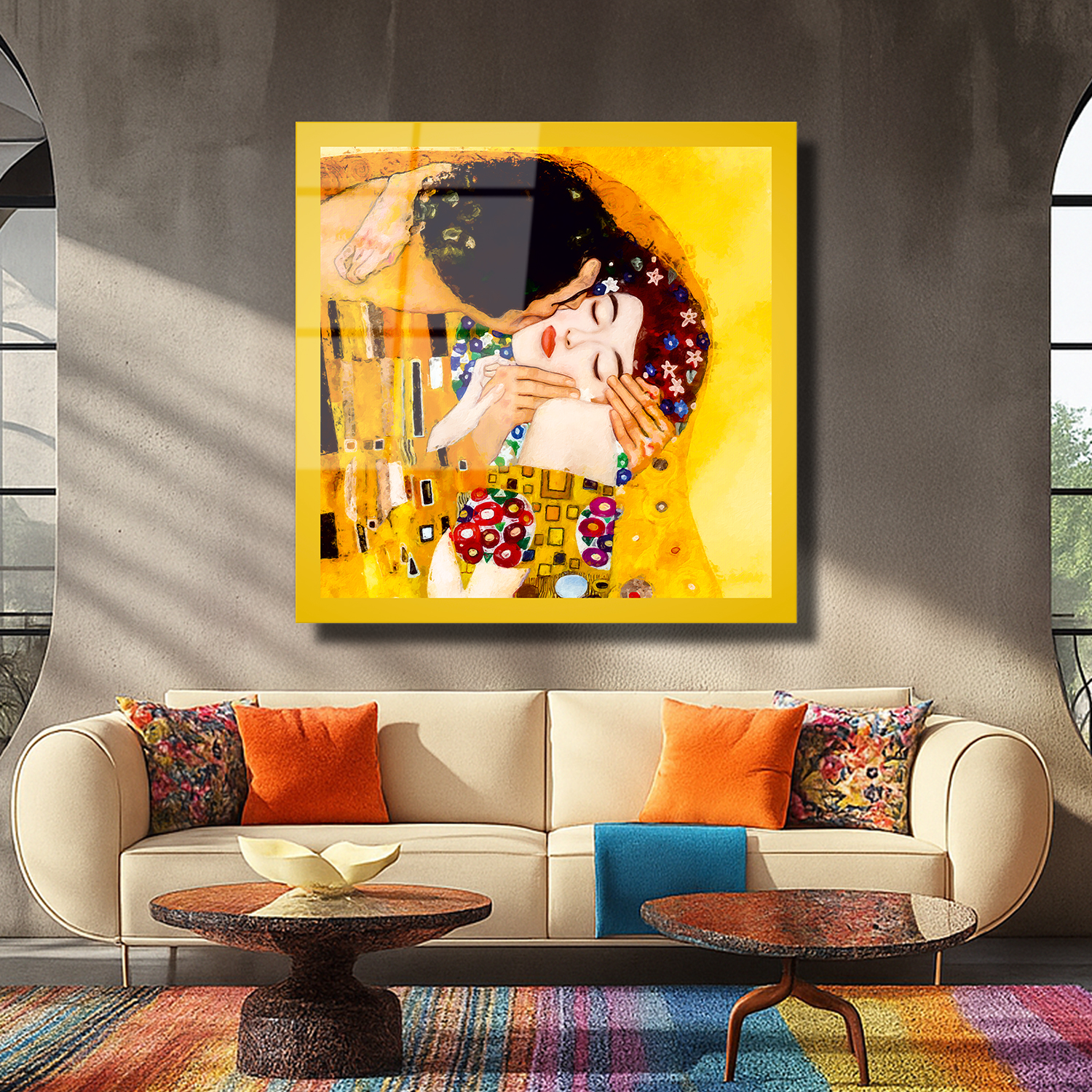 Altın tonlarının büyüsünü yansıtan bu eser, iki ruhun derin bağını ve tutkuyu ölümsüzleştiriyor. Parlak cam yüzeyi, esere modern bir şıklık katarken aynı zamanda renklerin canlılığını artırıyor. Her bakışta huzur, sevgi ve romantizmi evinize taşıyor.